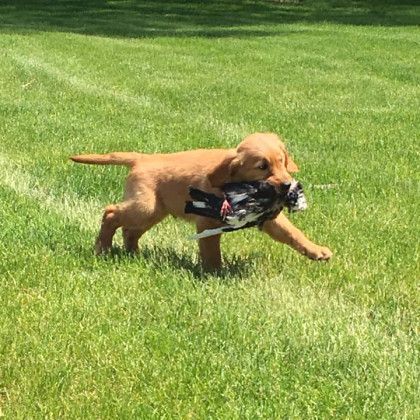 When the puppy gets to be about 10 weeks old I like to introduce them to a live pigeon, chucker, or quail. Again I want to use something small. I will clip the feathers off one wing. If I clip the feathers off both wings then the bird can fly. I want the bird to jump and run around. I will also at this time put a 20 foot leash on my puppy. I make sure I hold my puppy and let them see the bird. I hold the bird so it can't hit the puppy in the face for the first time. Once the puppy shows some interest in it, I toss it a little ways out and encourage the puppy to get it. When your puppy grabs the bird tell them that they are a good dog and encourage them to come back to you. When your puppy picks up the bird give a tug on the leash and say here. You want to encourage your puppy to get the bird and bring it back to you. Not to run around for an hour or chew on it. If I form this habit now then I won't have a problem of them not coming back to me later.